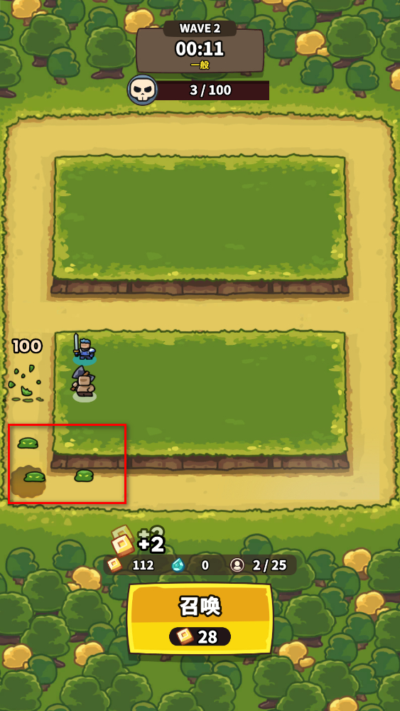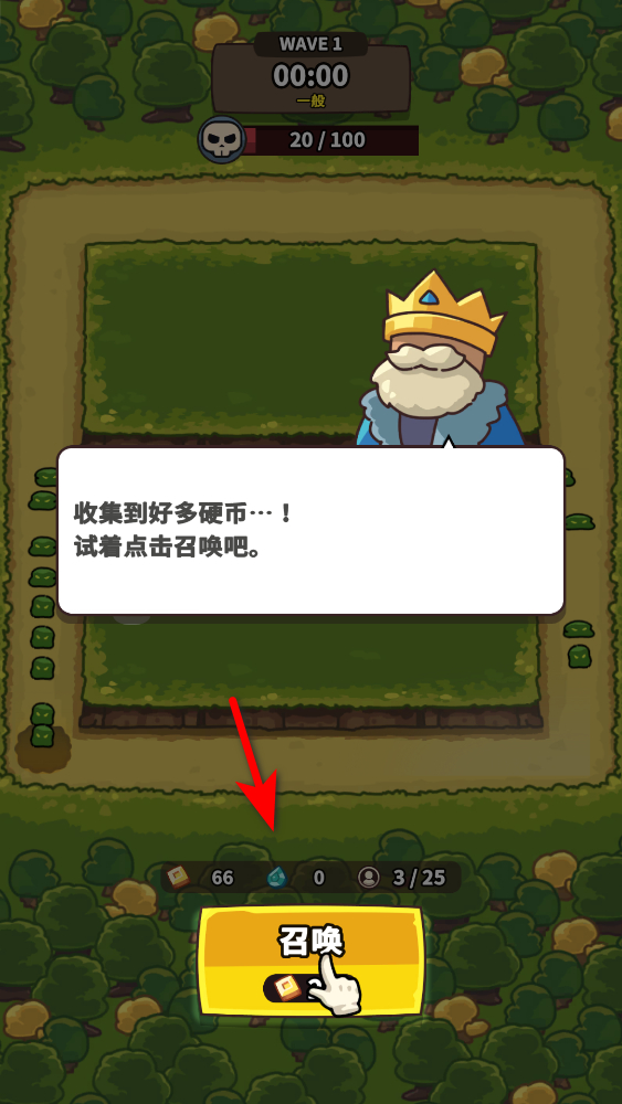 1、進入關卡,收集到硬幣后,點擊下方召喚按鈕,隨機召喚防御兵種,利用兵種阻擋敵人進攻,守護國王安全。