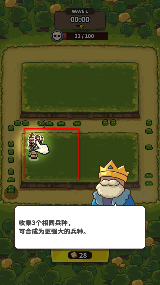 2、當場上有3個相同兵種時,點擊它們進行合成,獲得更強大的兵種,提升防御能力,應對后續更強敵人。