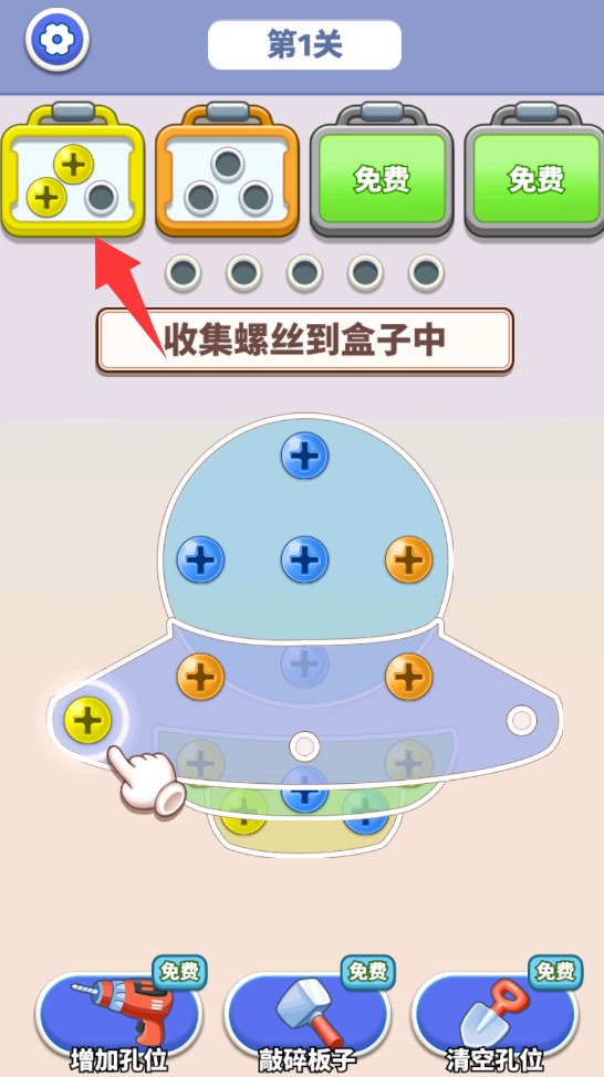 1、尋找顏色和箭頭方向相同的小車,通過滑動使其移動到對應螺絲位置,完成匹配即可消除目標螺絲。