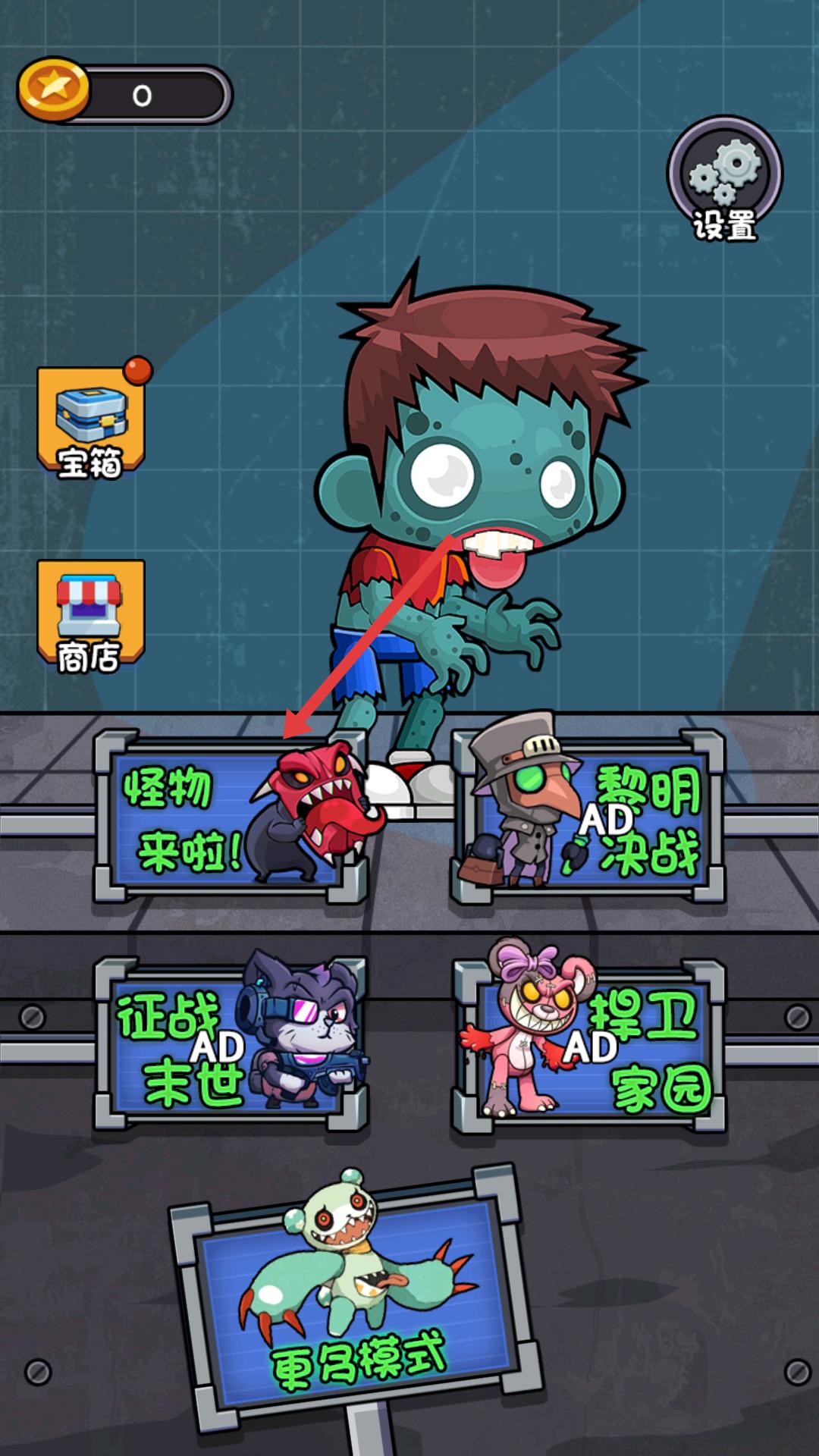 1、點擊怪物來啦模式,進入僵尸主題關卡,操控角色應對怪物來襲,開啟生存挑戰。