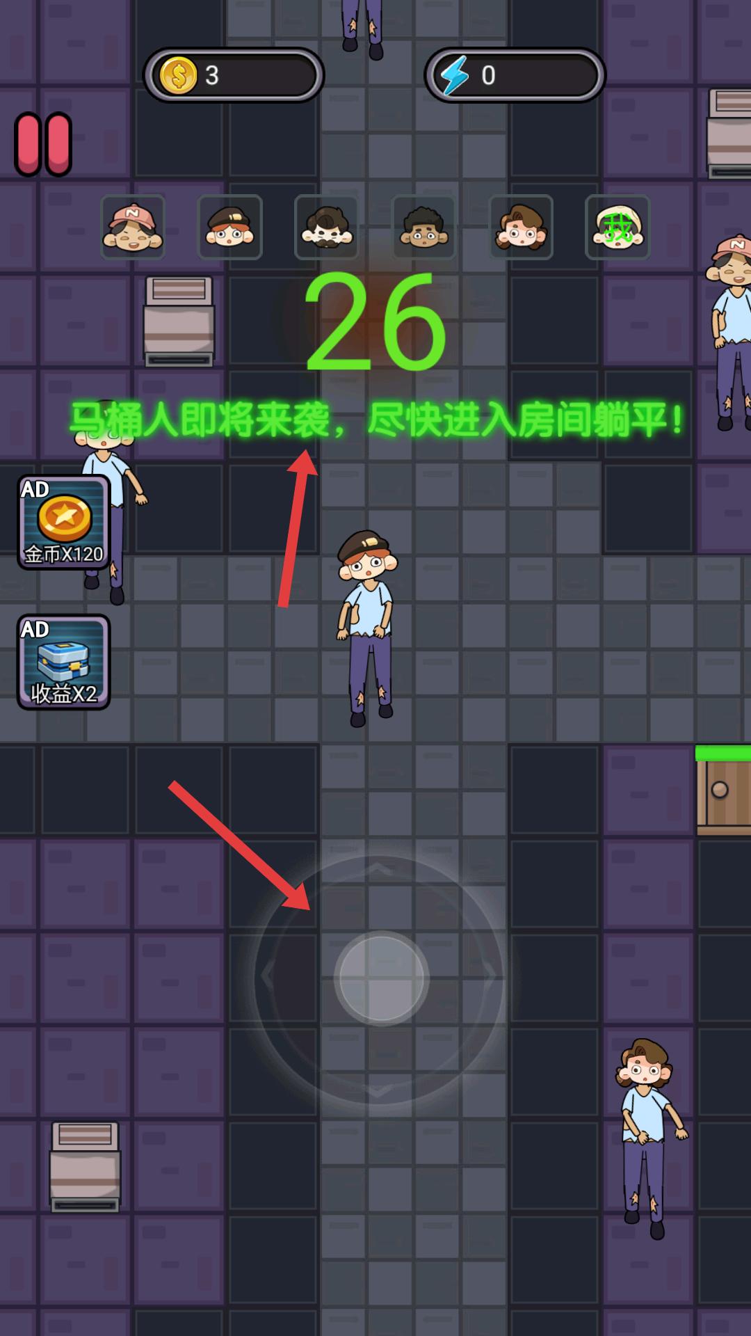 2、馬桶人來襲前,快速移動角色至房間,利用虛擬搖桿控制方向,及時躺平躲避,積累金幣。