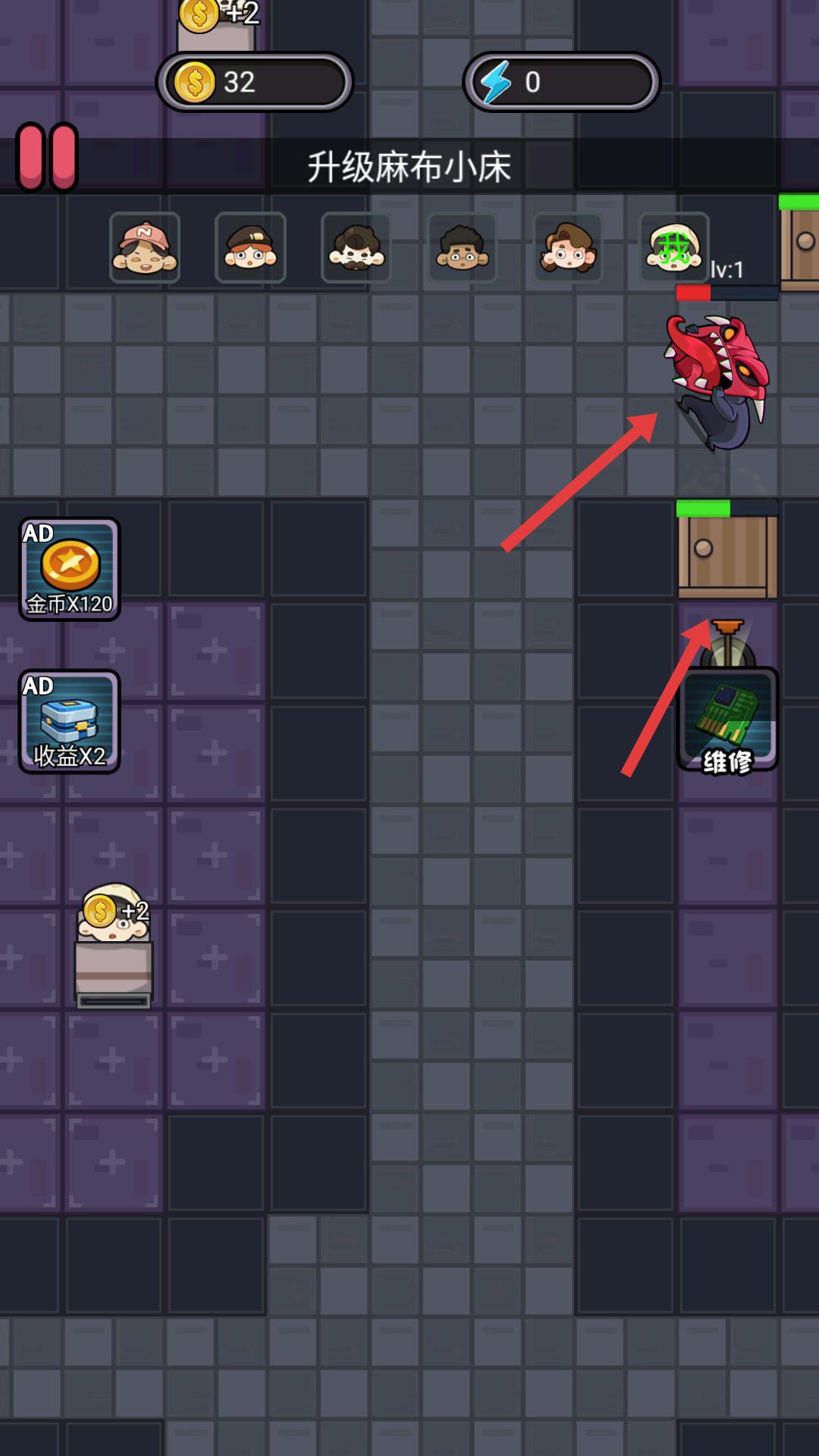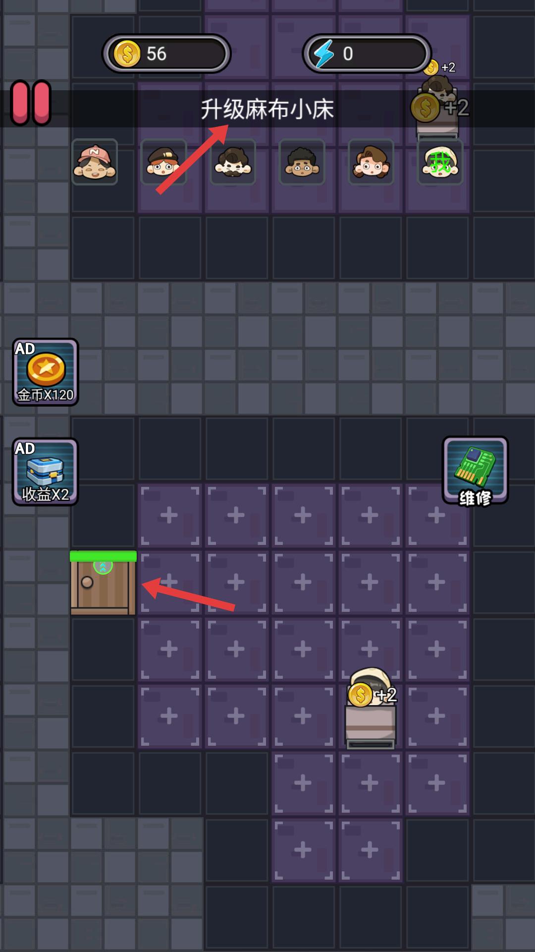 3、獲得金幣后,升級麻布小床提升收益,同時關注房間門狀態,按需維修,保障生存環境安全。
