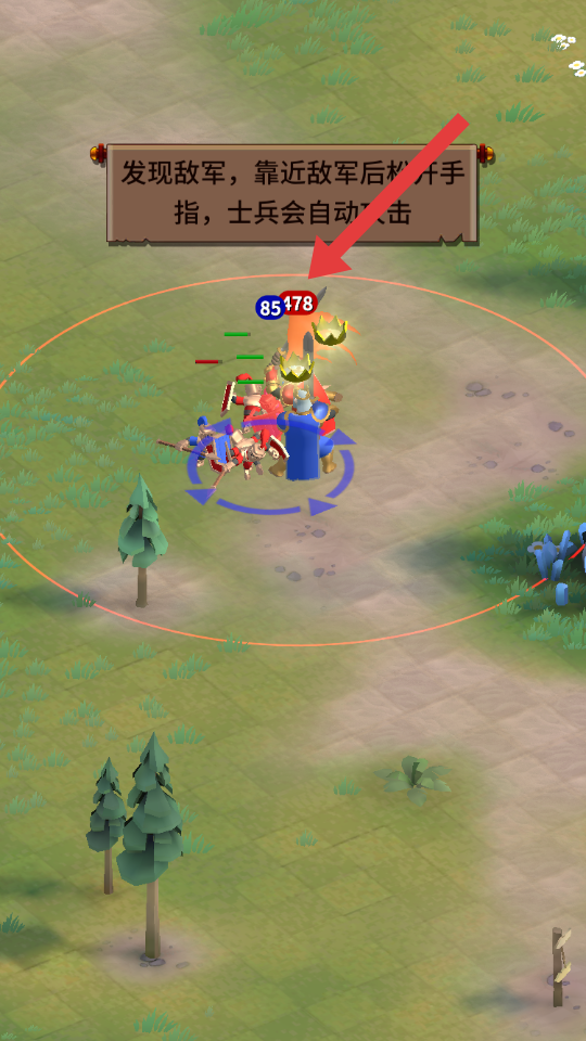 3、發現敵軍后,靠近并松開手指,己方士兵會自動攻擊敵人,戰斗過程中根據雙方兵力和屬性等因素判定勝負。