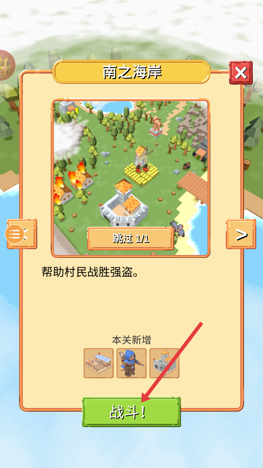 1、在游戲界面了解關卡背景,比如南之海岸關卡需要幫助村民戰勝強盜,點擊戰斗按鈕進入戰斗準備階段,這一步驟是開啟冒險的起點,讓玩家明確戰斗目標。