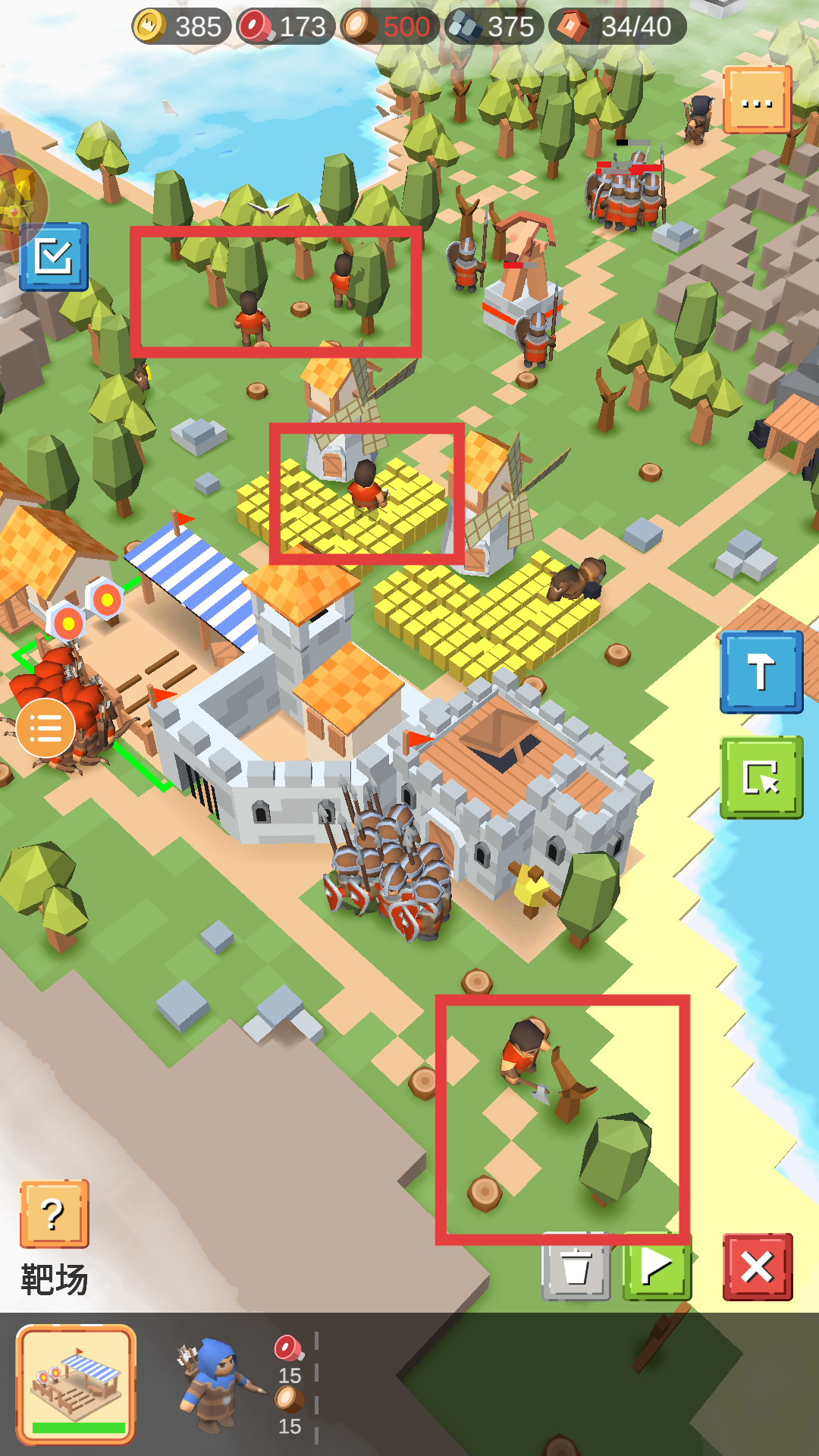 2、進入戰斗場景后注意屏幕上方的資源數值,同時觀察場景中的各類元素,還有樹木、建筑等地形要素,這些信息對制定戰術至關重要,玩家需要派遣村民去積累資源。