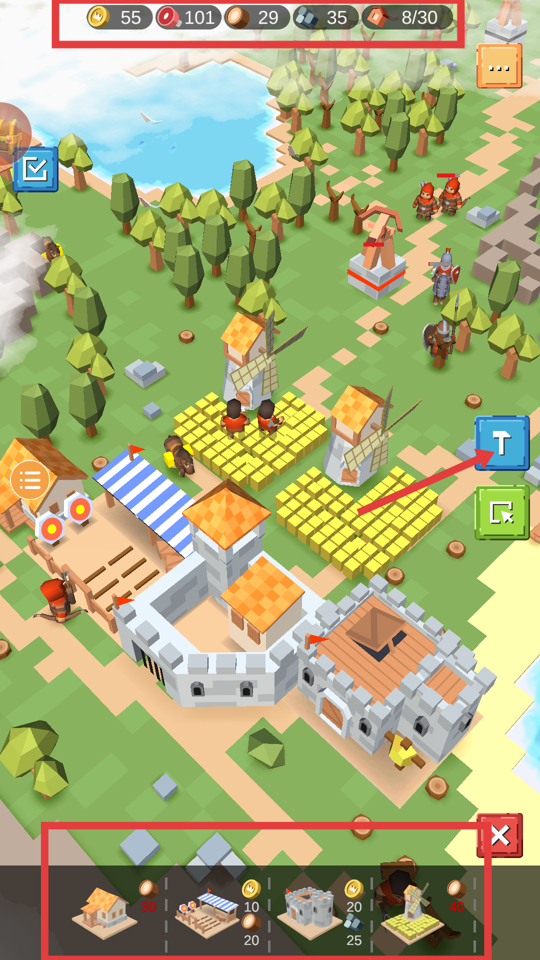 3、點擊屏幕下方的建筑和單位圖標,消耗對應資源來招募士兵或建造建筑,例如花費一定金幣和木材招募弓箭手、步兵等,合理分配資源構建起強大的戰斗陣容。