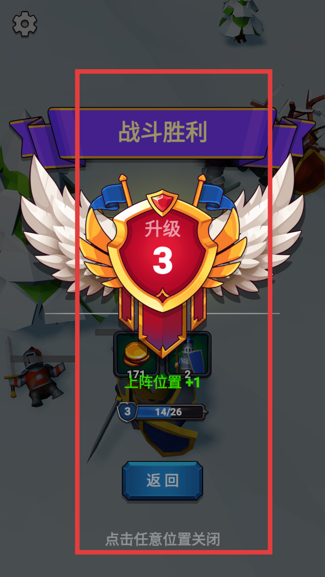 4、當成功擊敗所有敵人,顯示戰斗勝利界面可獲得升級等獎勵,點擊任意位置關閉界面后,可利用獲得的資源,回到主界面進行隊伍強化,為下一場戰斗做好準備。
