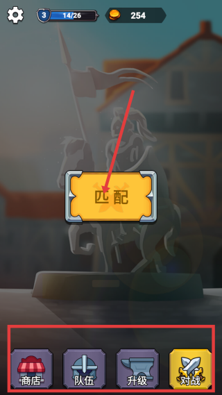 1、主界面屏點擊匹配按鈕就能開始尋找對手,也可通過下方的商店、隊伍、升級、對戰按鈕,進行購買道具、編排隊伍、提升屬性等戰前準備工作。