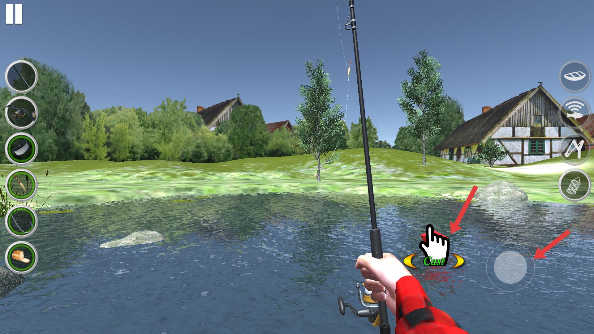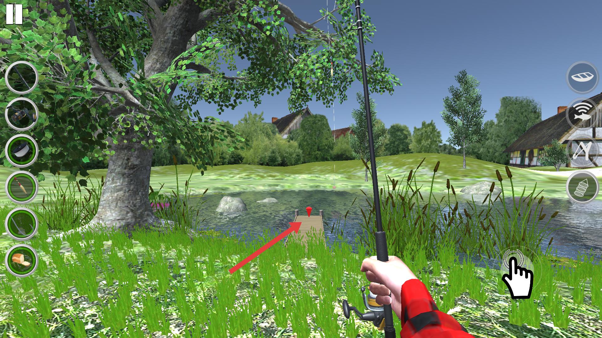 2、在釣魚場景,將魚竿瞄準箭頭指向的碼頭區域拋竿,點擊右側對應位置操作,讓魚鉤落入目標水域,等待魚咬鉤,此區域易吸引魚類。