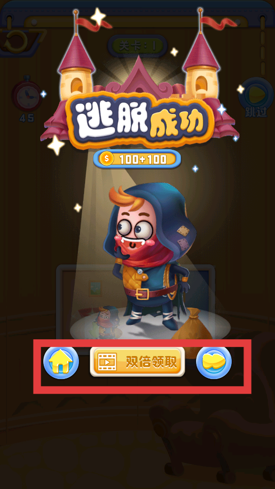 4、逃脫成功后,可選擇首頁返回、雙倍領取看廣告獲更多金幣或直接領取獎勵,積累資源開啟新關卡。