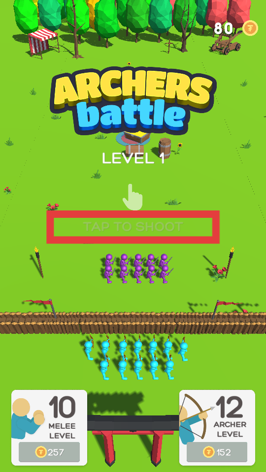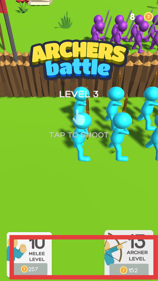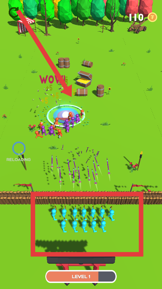 2、玩家通過指揮己方弓箭手藍色小人射擊,箭矢可打擊敵方紫色小人,消耗敵方兵力。