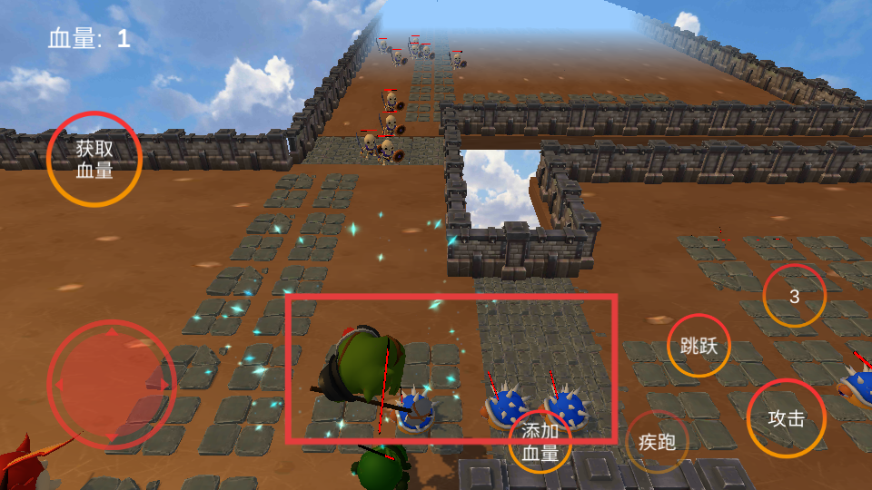 3、利用屏幕右側的攻擊按鈕對敵人如骷髏兵、帶刺怪物等進行攻擊,還能使用跳躍、躲避敵人傷害疾跑快速移動。