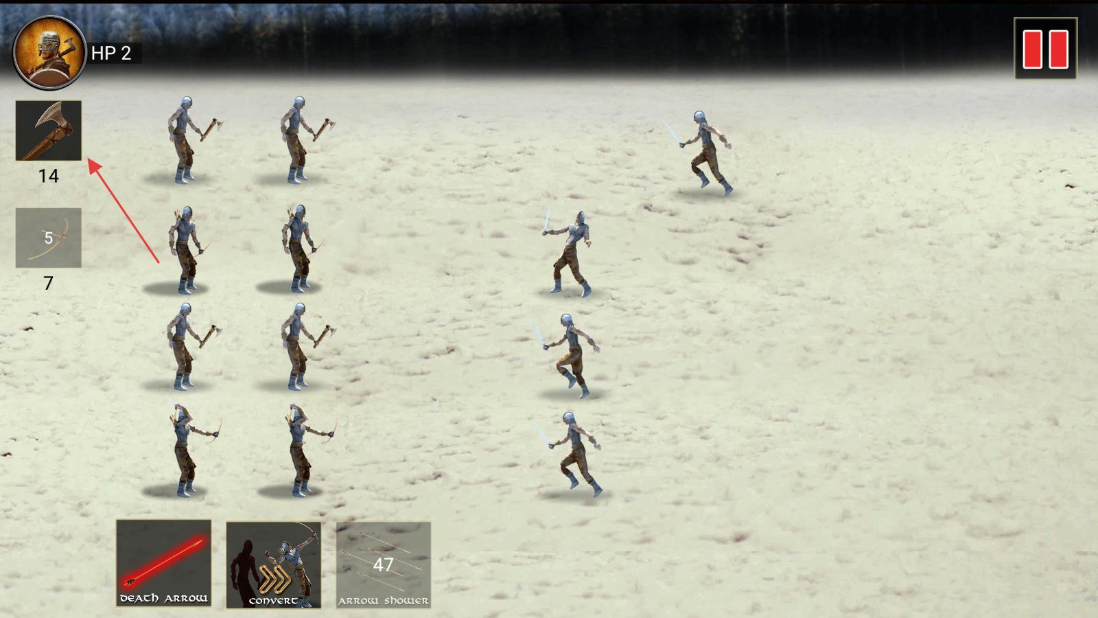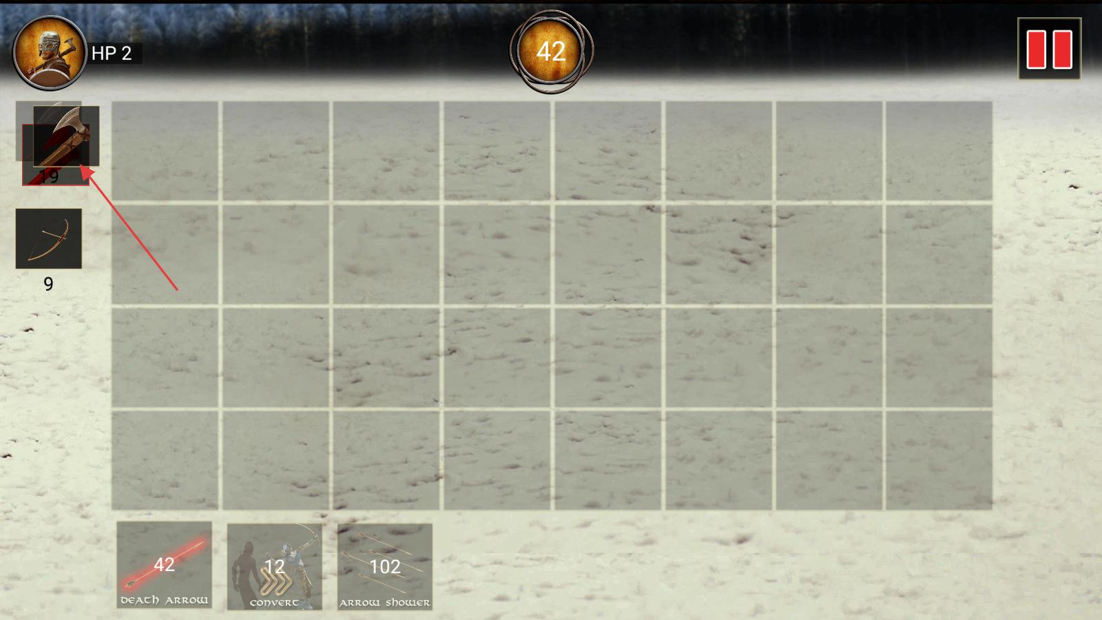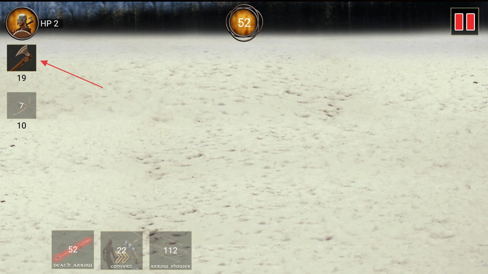 1、進入游戲界面,左側有斧頭、弓箭等武器選項,依據戰斗需求,點擊挑選合適武器,為戰斗做準備。
