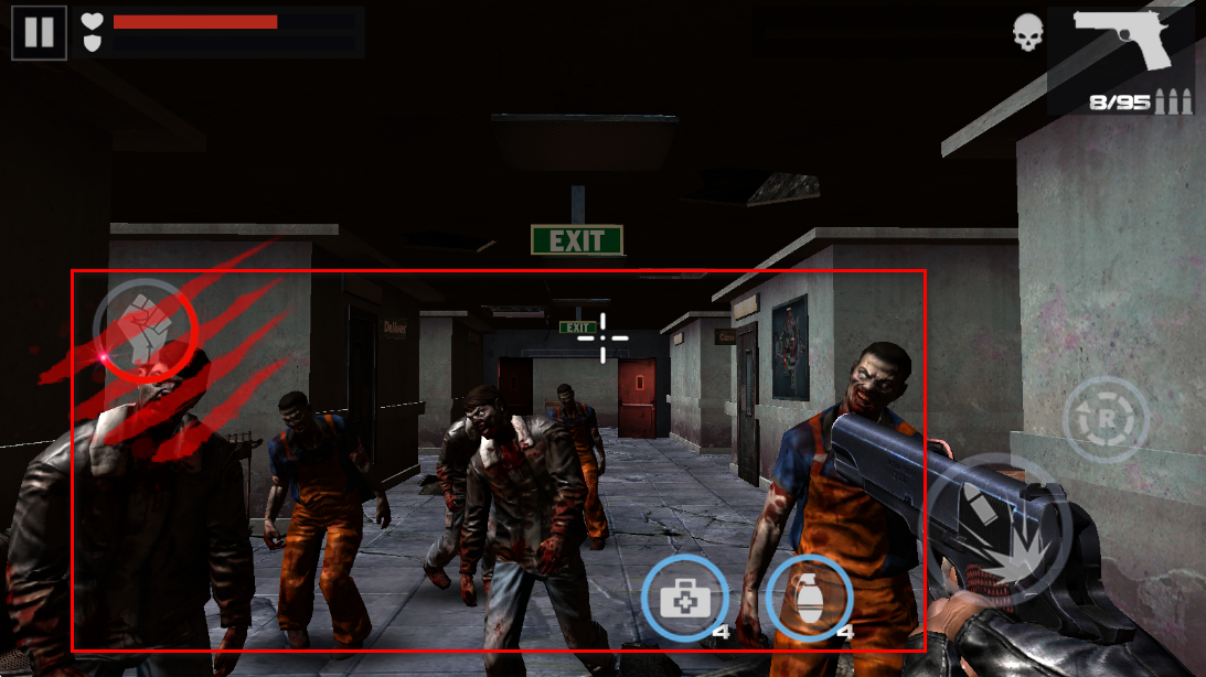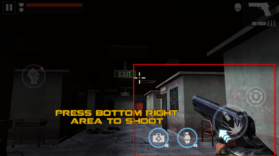 1、進入昏暗場景,能看到手槍和右下角的射擊區域提示,點擊該區域就可以開槍,同時還有醫療包和手雷等道具可使用,為戰斗做準備。