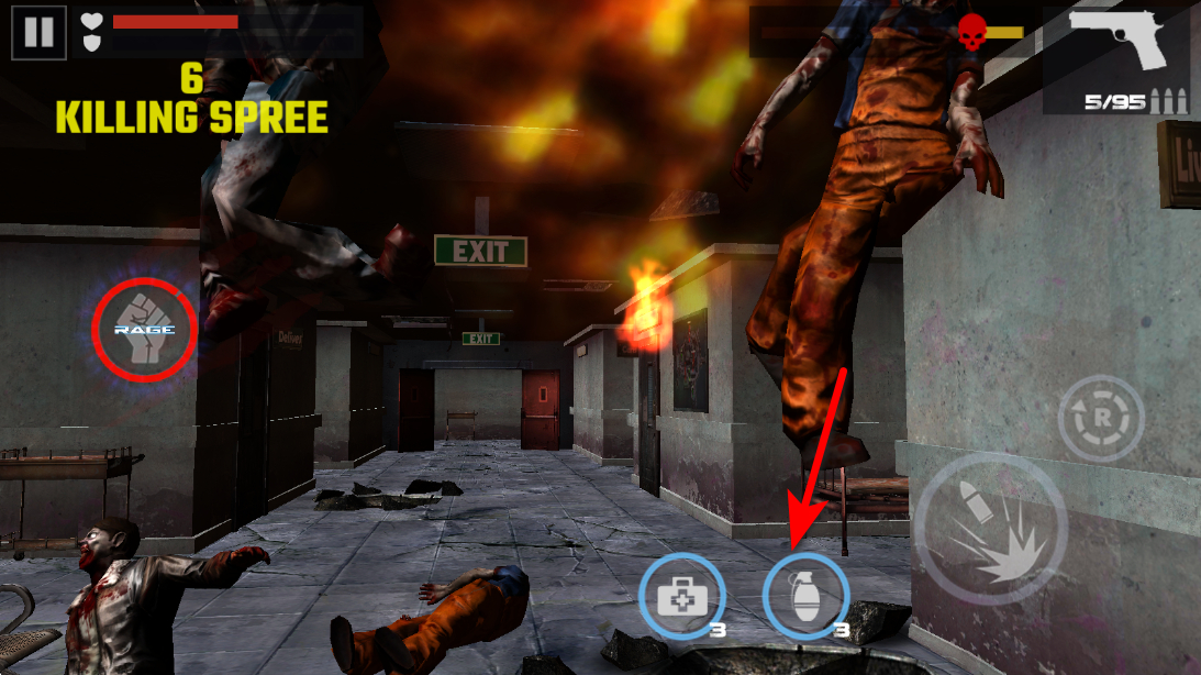 3、在連續擊殺僵尸時,會觸發殺戮狂歡效果,此時可使用手雷,點擊手雷圖標,能對范圍內的僵尸造成大范圍傷害,快速清剿僵尸。
