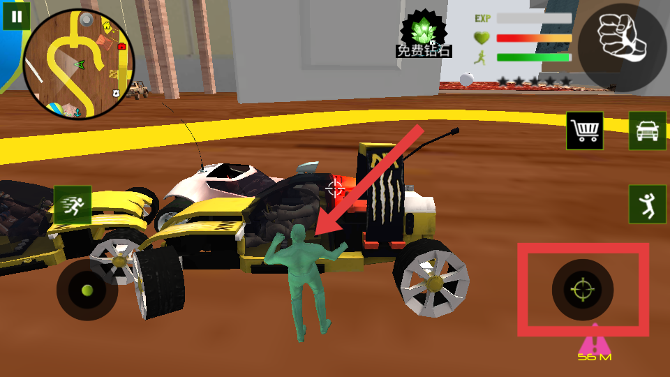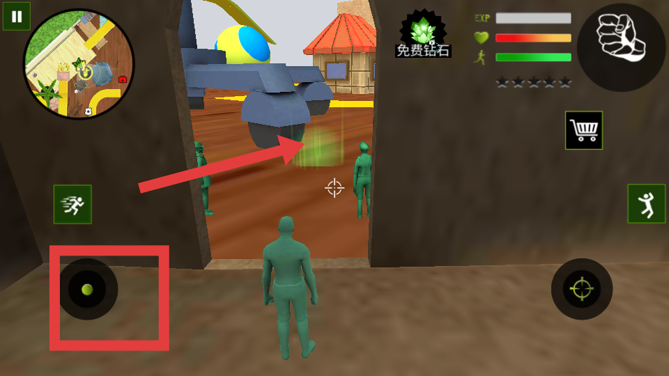 3、玩家通過左下角的虛擬搖桿控制角色移動,利用右下角類似準星的按鈕進行射擊,以此來攻擊敵人。