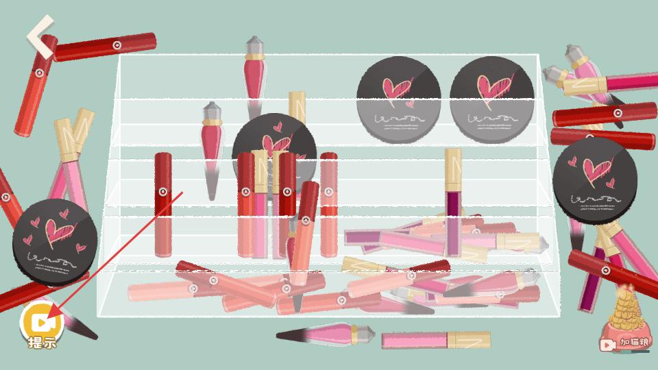 2、在選擇關卡界面點擊唇唇欲動關卡,進入該關卡的收納場景,場景中有雜亂的化妝品,需要將這些化妝品整理到透明收納架中。