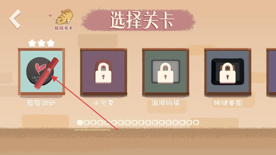 1、點擊游戲主界面開始游戲按鈕,進入選擇關卡界面,此時能看到唇唇欲動等關卡選項,選擇可進入的關卡,開啟收納任務。