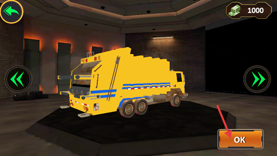 2、啟動游戲后進入車輛選擇界面,展示著一輛垃圾車,在界面右下角有個OK按鈕,點擊該按鈕就選定了這輛垃圾車,為接下來的駕駛操作做好準備。