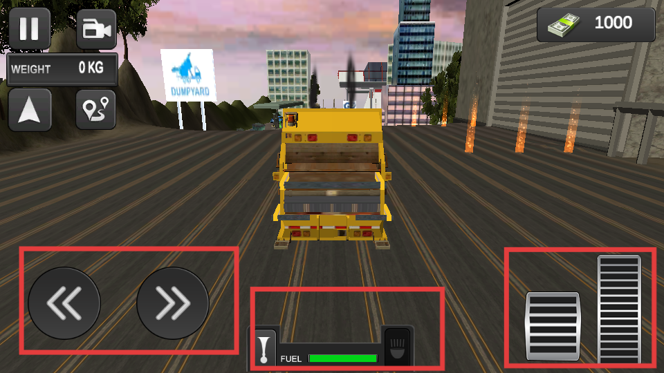 3、駕駛場景左側的左右箭頭按鈕用于控制垃圾車的轉向,右側的踏板類按鈕分別對應加速和減速,下方還有燃油顯示條,需留意燃油情況,操控垃圾車前往垃圾站。