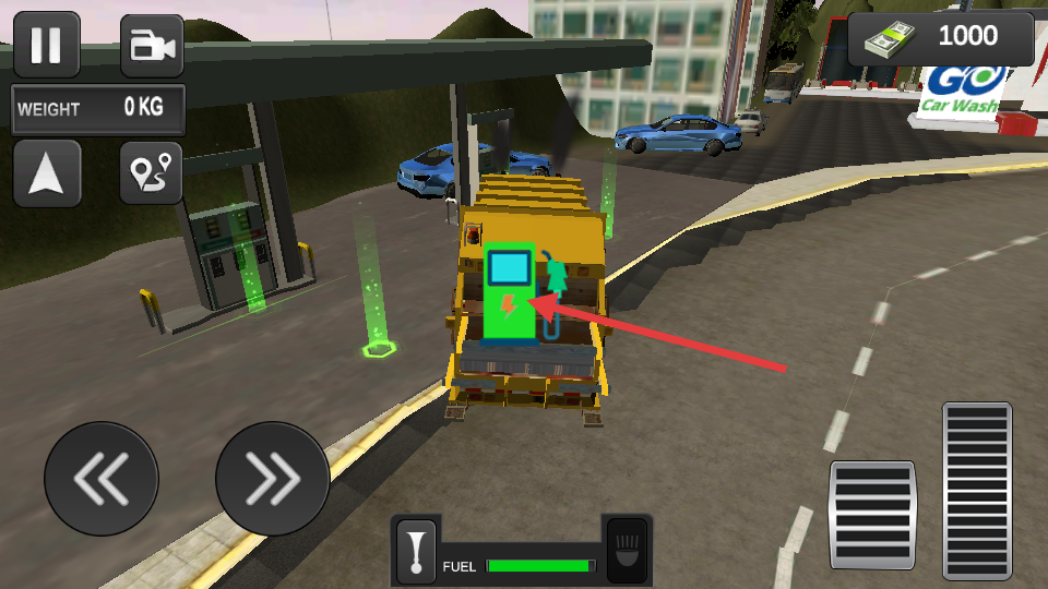 4、行駛過程若燃油不足要前往加油站,當垃圾車靠近加油站的加油區域時,會出現綠色的加油提示,此時進行加油操作可補充燃油,維持車輛正常運行。