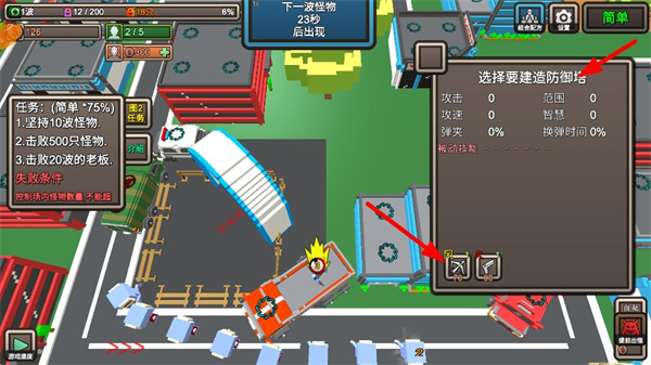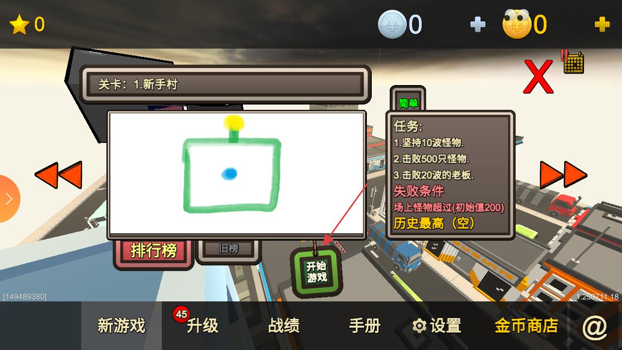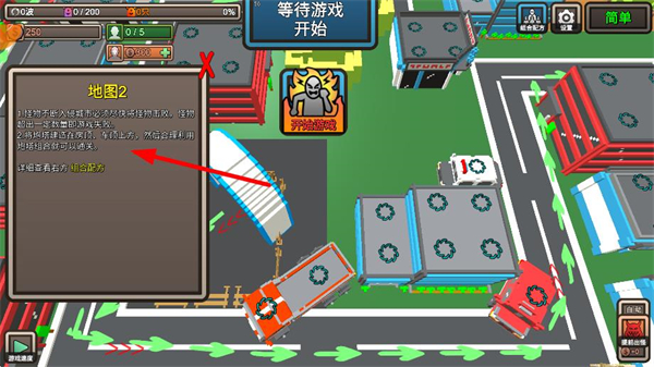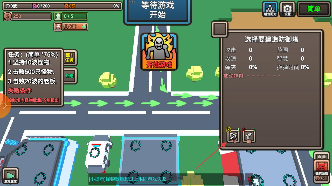 1、關卡顯示任務有堅持10波怪物、擊敗500只怪物、擊敗20波老板,失敗條件是場上怪物超200,點擊開始游戲進入關卡。
