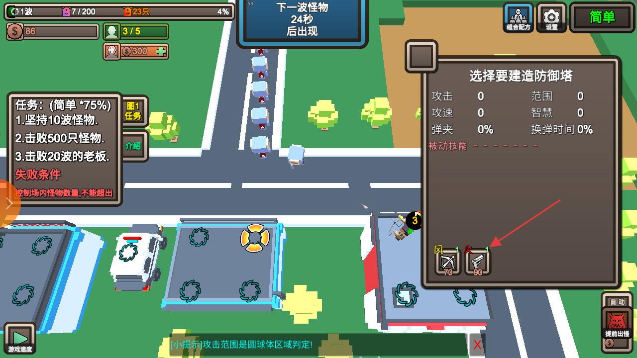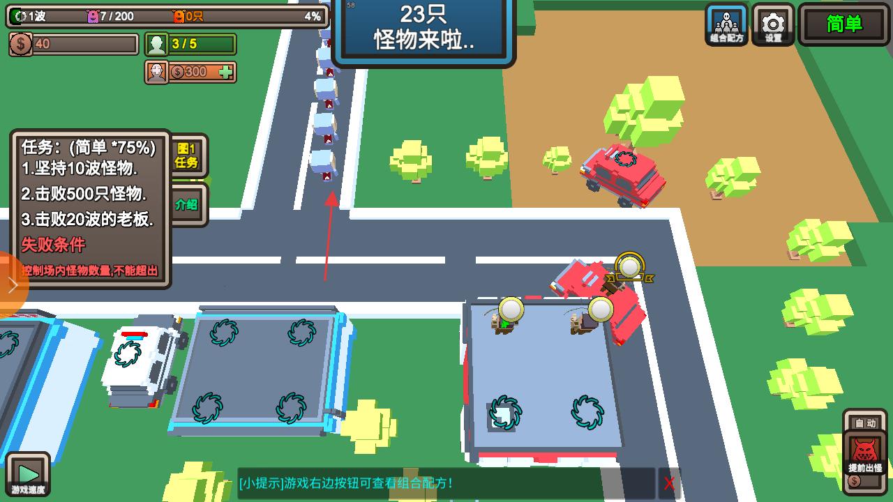 1、可查看地圖2規則,需盡快擊敗入侵怪物,將炮塔建在房頂、車頂,合理組合炮塔通關。