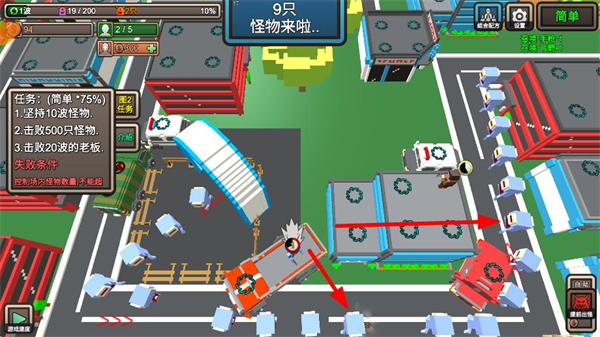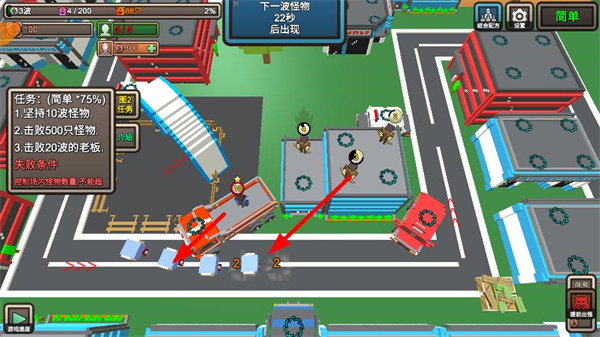 2、游戲過程怪物不斷來襲,需堅守10波怪物,擊敗500只怪物和20波老板,控制場內怪物數量避免失敗。