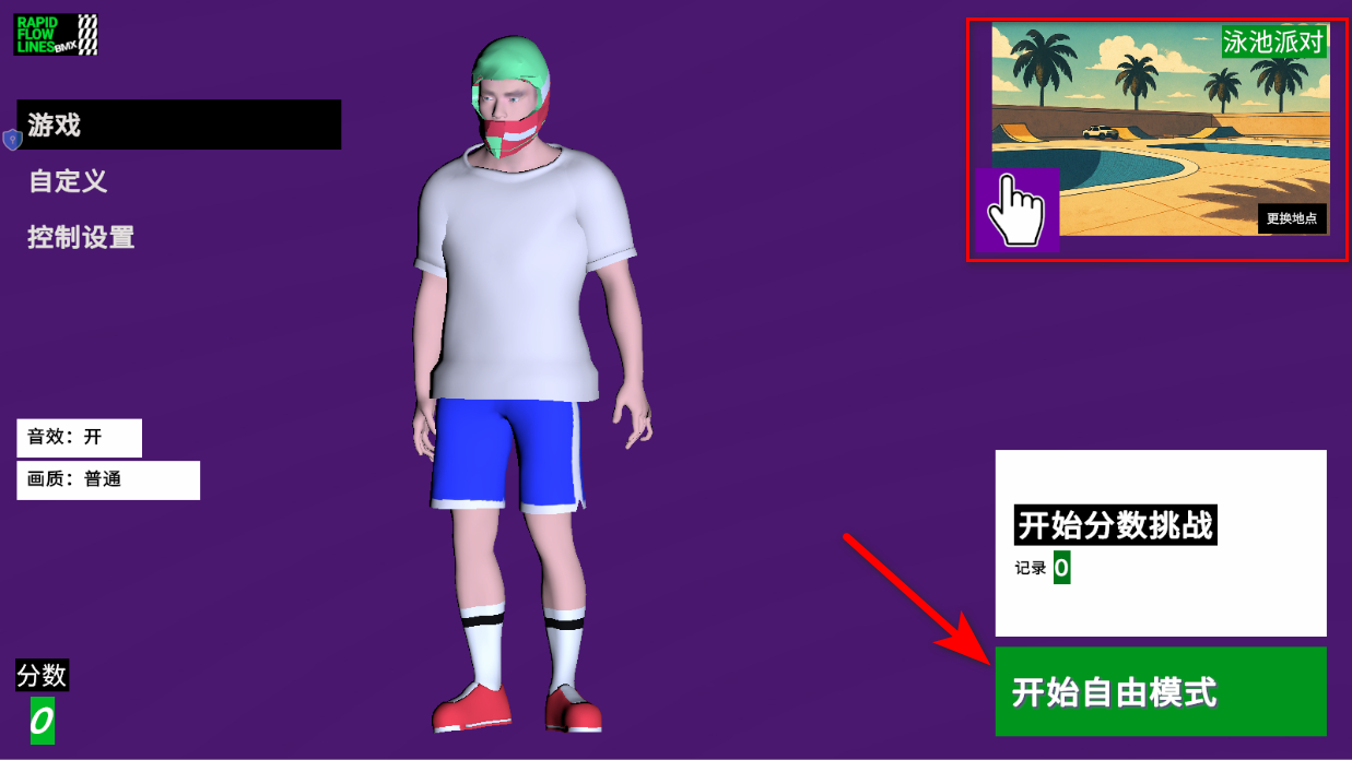 1、進入游戲界面,可選擇開始自由模式,也能更換地點,比如換成泳池派對場景,然后開啟小輪車的冒險之旅。