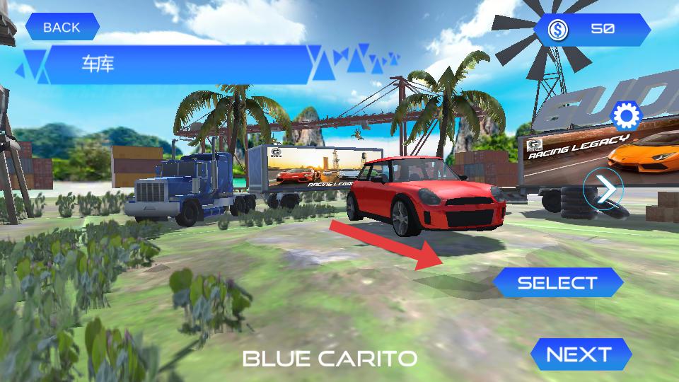 3、在車庫里,選好賽車后,點擊select,確認所選賽車,然后可進行下一步,進入賽車對決匹配。