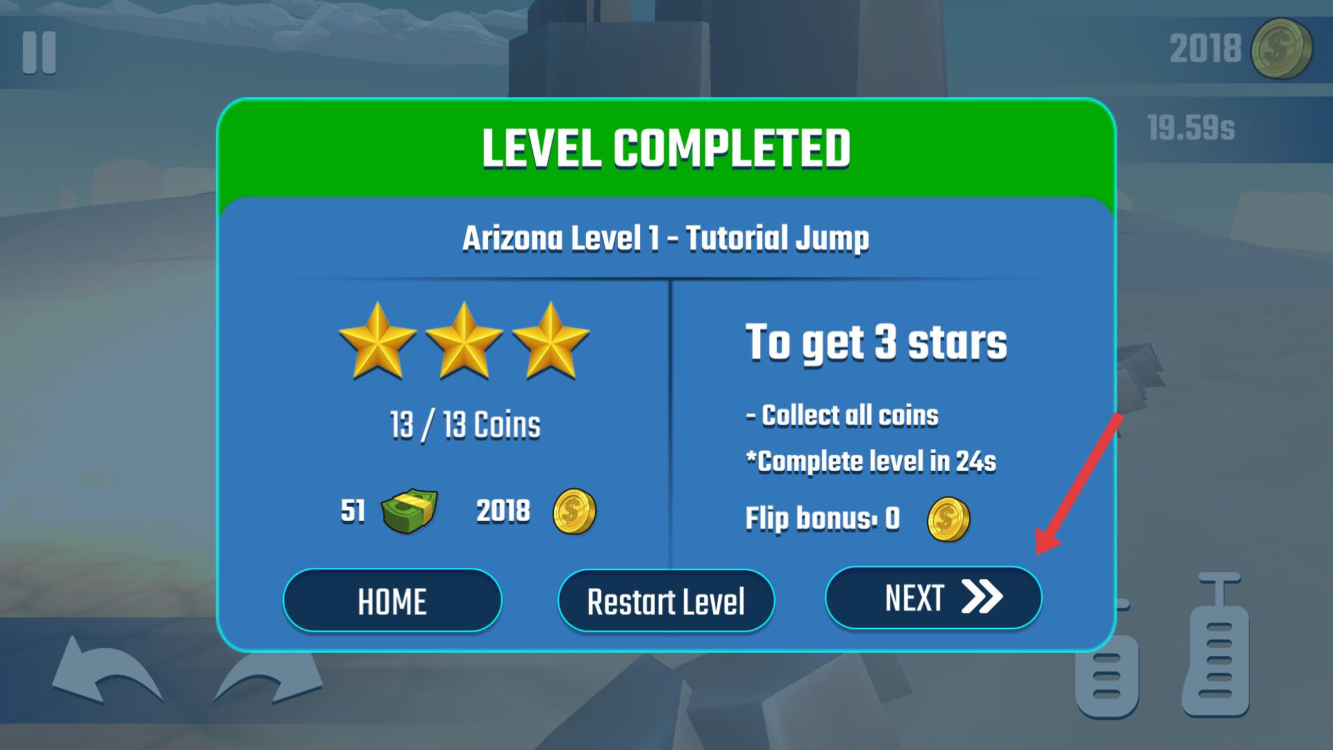 4、收集足夠金幣并達成通關條件后,會彈出關卡結算界面,此時點擊下一個按鈕,就能進入下一個賽車特技關卡,繼續挑戰。