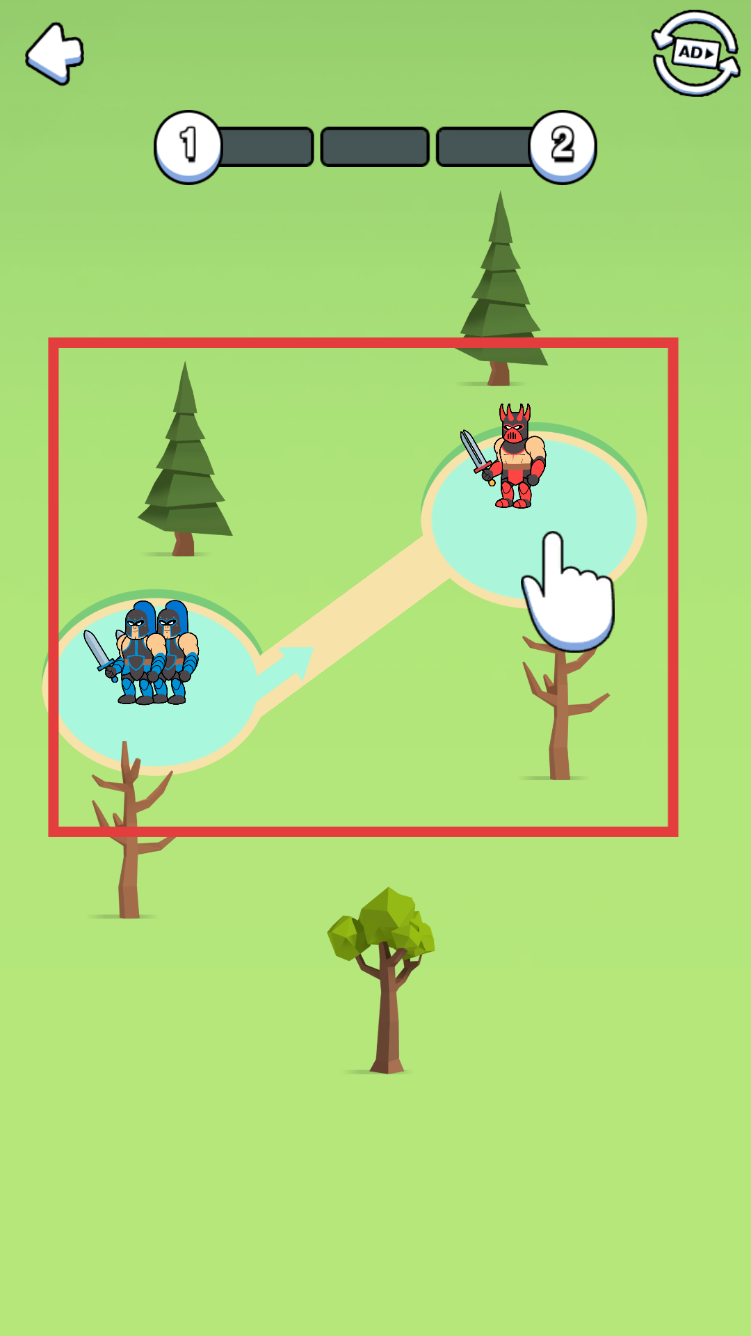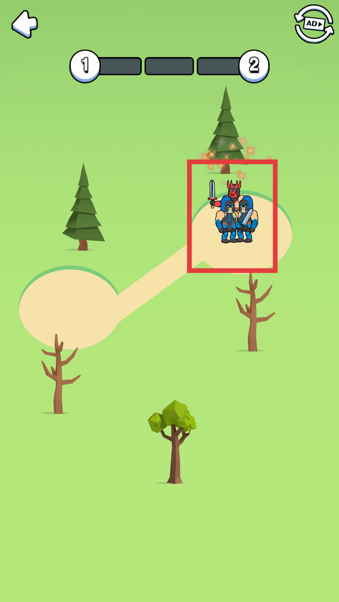 2、進入游戲關卡界面后,界面中間有連接的路徑,按照提示,將藍色戰士從初始區域拖動到紅色惡魔所在的區域,使藍色戰士向紅色惡魔移動。