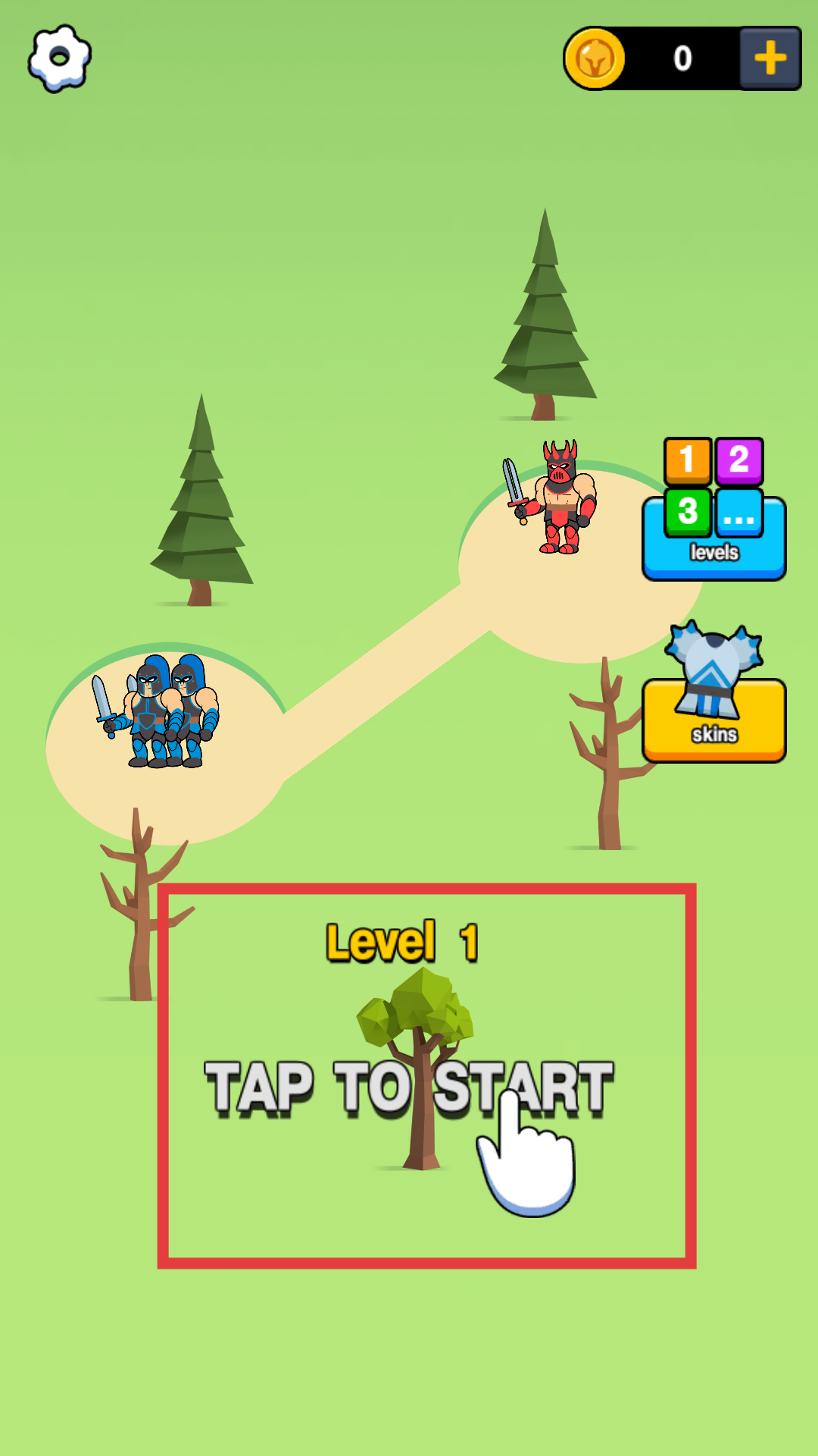 1、打開戰爭自走棋進入游戲主界面,界面背景為綠色草地,有幾棵樹木,顯示Level1以及提示,點擊TAP TO START區域,進入游戲關卡界面。
