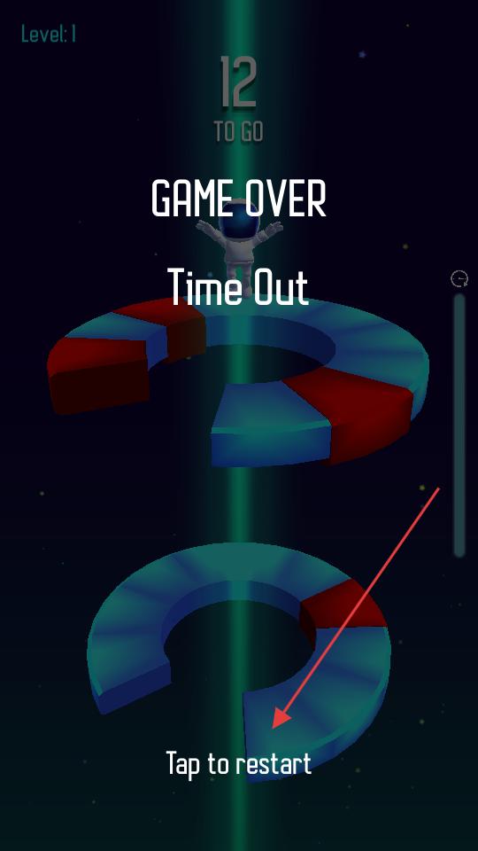 4、若太空人掉落或出現GAMEOVER提示,此時點擊Taptorestart,重新開始游戲,再次操控太空人進行下落闖關挑戰。