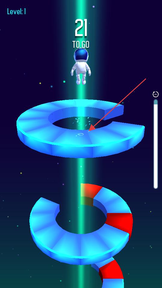 2、隨著太空人不斷下落,遇到帶有紅色區域的環形平臺時,操控太空人避開紅色區域,選擇藍色區域移動,繼續向下方平臺行進。