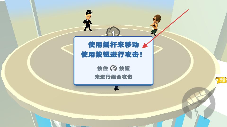 2、在格斗場景里按照提示用搖桿移動角色,用按鈕進行攻擊,按住拳頭按鈕可進行組合攻擊,與場景中的其他角色對戰。
