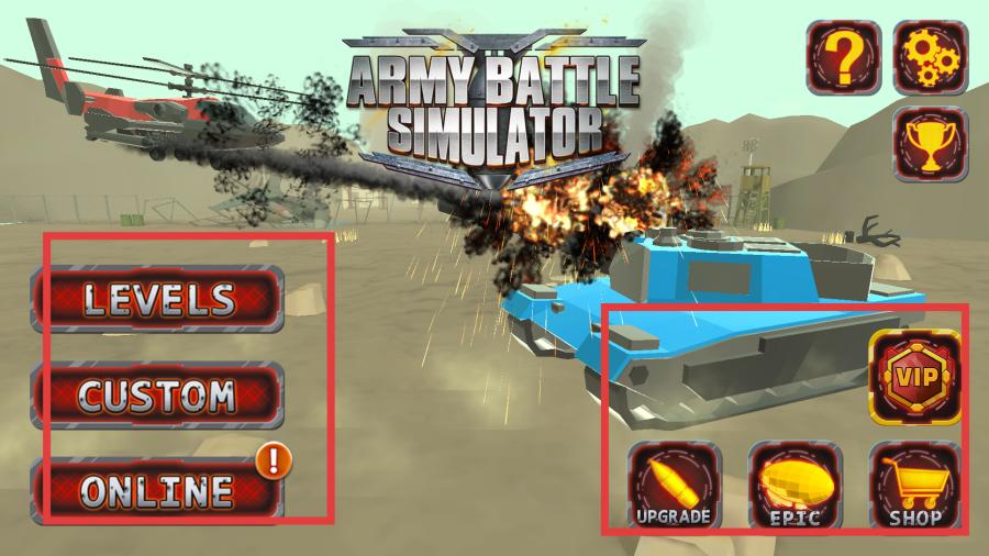 1、打開全面坦克模擬器進入主界面,界面有LEVELS、CUSTOM、ONLINE等模式按鈕,還有UPGRADE、EPIC、SHOP及VIP按鈕,點擊UPGRADE按鈕,進入兵種升級界面。