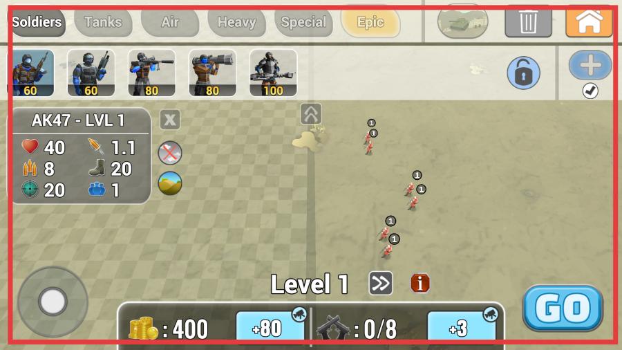 3、完成兵種升級后返回主界面,點擊LEVELS按鈕,進入戰斗部署界界面,界面頂部有兵種分類標簽,下方展示可部署的兵種,從兵種欄中選擇兵種,將其部署到合適的位置。