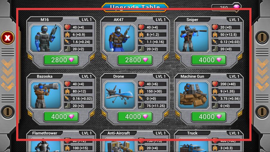 2、進入兵種升級界面,該界面展示了多種兵種,每個兵種顯示等級、生命值、彈藥數、傷害等屬性,以及升級所需的鉆石數量,根據需求選擇要升級的兵種。