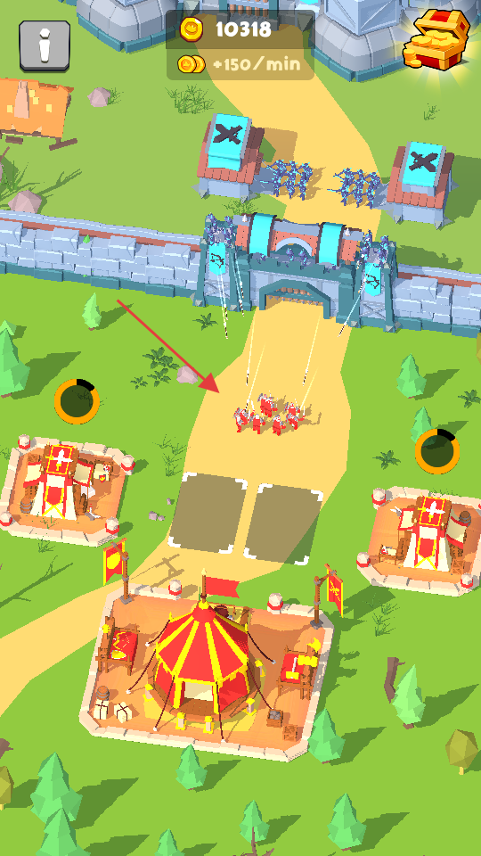 1、游戲的戰斗場景,紅色士兵隊伍向敵方城堡進發,城堡具備防御工事,周圍有兵營等建筑。