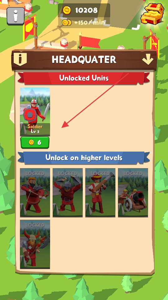 2、游戲的總部界面,已解鎖3級士兵,花費6金幣,還有弓箭手、戰士等單位需更高等級才能解鎖。