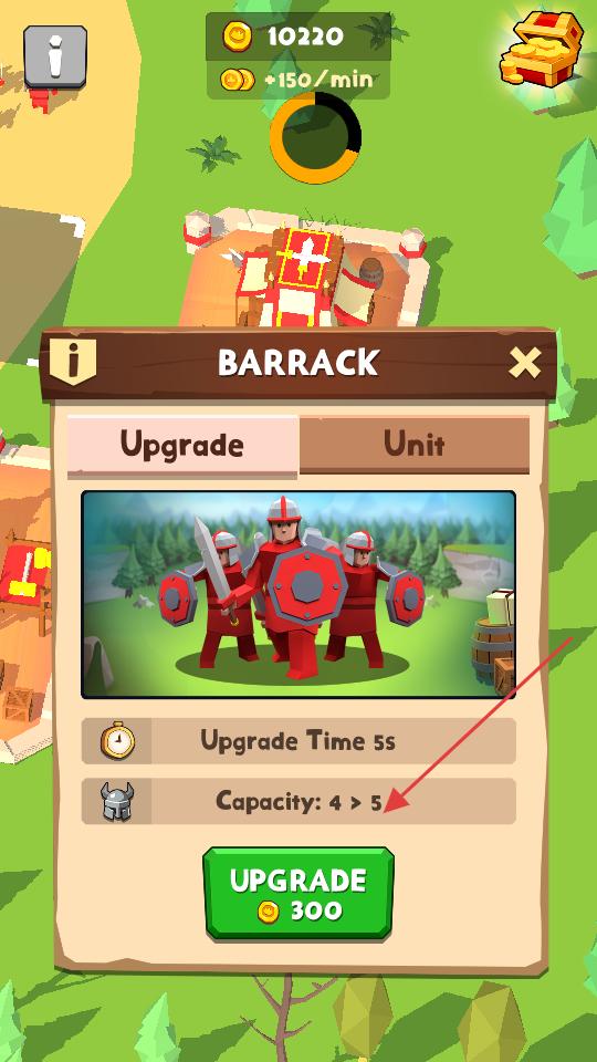 3、游戲里兵營的升級界面,升級耗時5秒,容量會從4增加到5,花費300金幣,可點擊綠色UPGRADE按鈕升級。