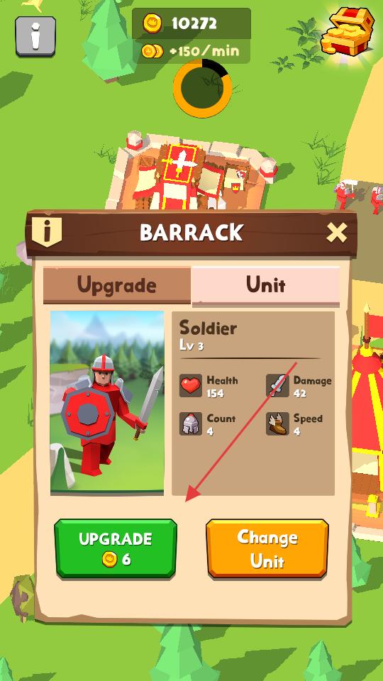 4、游戲中兵營的單位界面,展示3級士兵,生命值154、傷害42、數量4、速度4,可花費6金幣升級,也能更換單位。