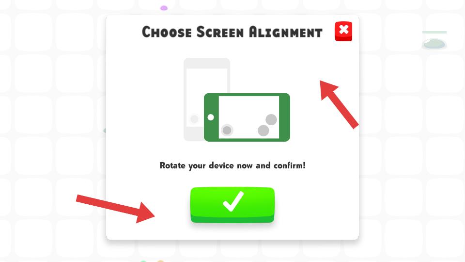 1、游戲開始前,需選擇屏幕對齊方式,按照提示旋轉設備后,點擊綠色對勾按鈕確認,完成設置進入下一步。