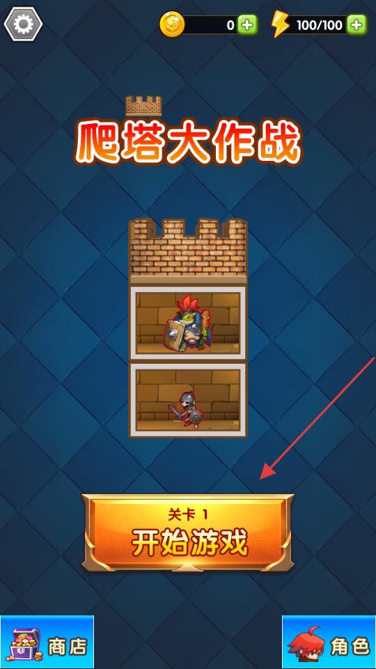 1、游戲的初始界面,顯示關卡1可開始游戲,界面有商店、角色等功能按鈕,還有金幣和能量的顯示。