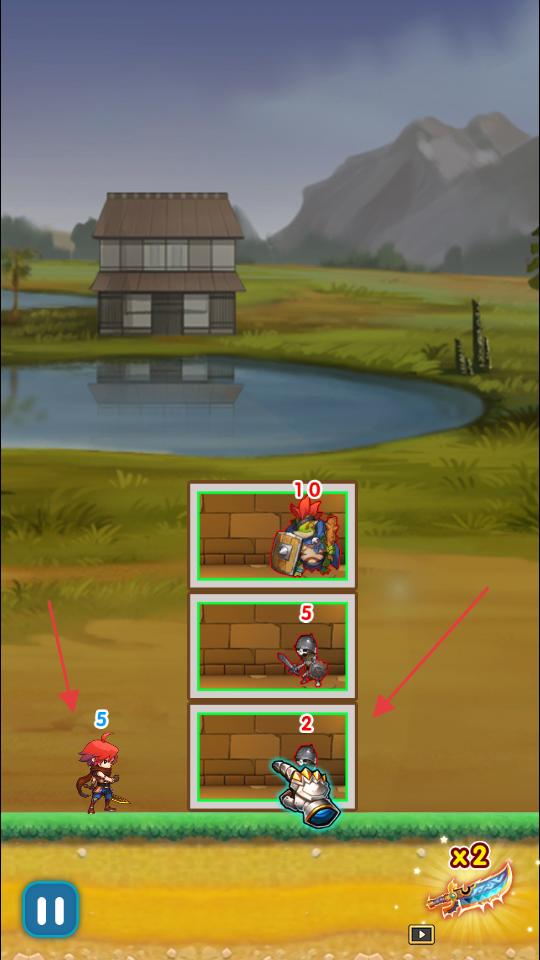 2、游戲戰斗場景,有不同層級的敵人,數值分別為10、5、2,我方角色和道具參與戰斗,背景是有房屋、湖泊和山脈的戶外場景。