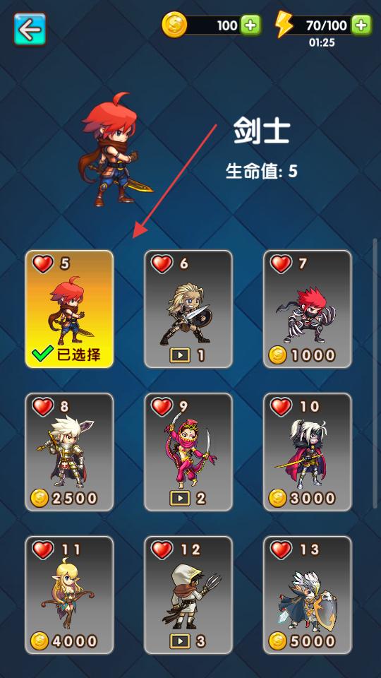 3、游戲的角色選擇界面,顯示劍士角色,生命值為5,有多個不同劍士角色可供選擇,部分需要觀看視頻或花費金幣解鎖。