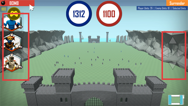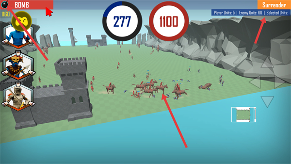 3、若當前局勢不利,可使用左上角BOMB技能打擊敵人,同時要關注雙方單位數量靈活調整戰術,若想放棄點擊右上角投降按鈕。