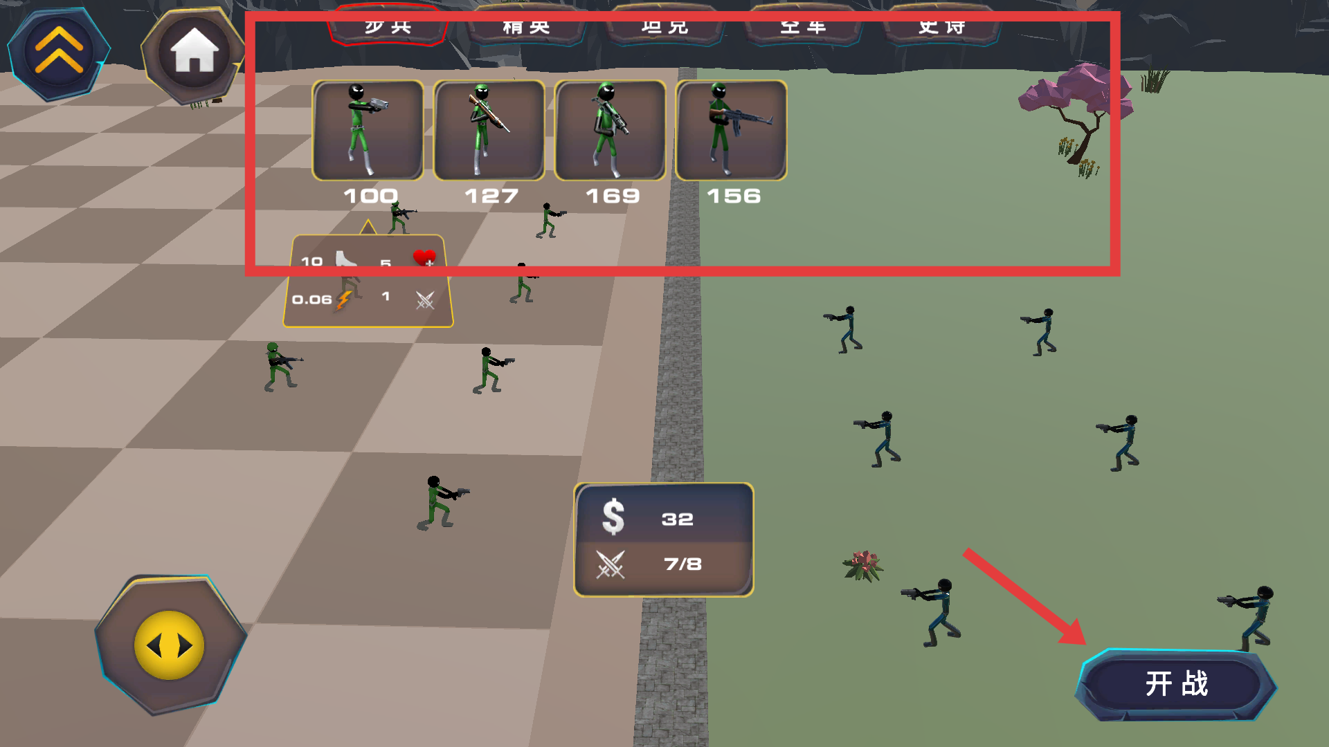 2、進入準備界面后,上方有不同兵種可選,根據金幣數量選擇合適兵種布置,布置好后點擊開戰,就能讓軍隊與敵軍交戰。