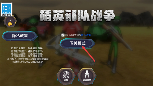 1、玩家進入游戲后,可以先去升級或購買史詩兵種為戰斗做準備,然后點擊闖關模式,即可開啟游戲闖關之旅。